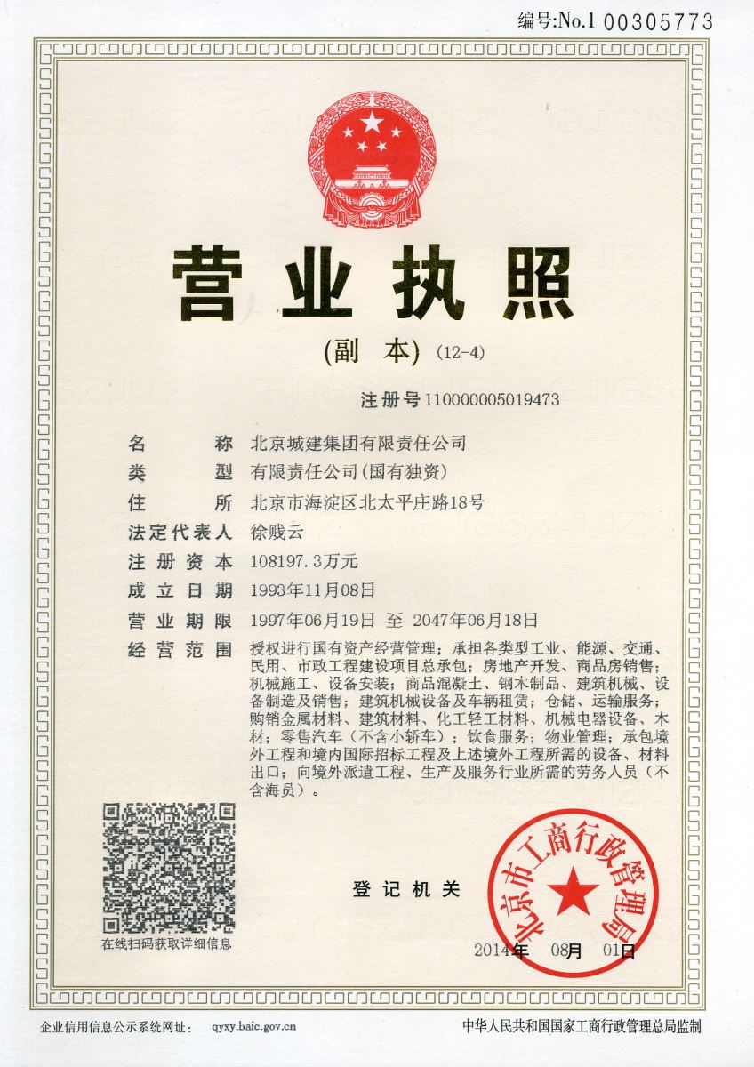 北京城建集团是以工程总承包、房地产开发、设计咨询为主业的大型综合性建筑企业集团,具有房屋建筑工程、公路工程施工总承包特级资质;工程设计综合甲级、工程测绘甲级、工程勘察综合甲级、风景园林工程专项设计甲级、工程咨询甲级、工程造价咨询甲级;房地产开发一级;市政公用工程、机电安装施工总承包一级、城市园林绿化一级、文物保护工程施工一级,地基与基础、钢结构、公路路面、城市轨道交通工程、园林古建等一批专业承包一级资质。集团在工业与民用建筑、市政工程、地铁、高速公路、园林绿化、深基础、长输管线等领域的设计和施工业务遍及全国,并涉足东南亚、中东和非洲多国,房地产开发业务也从北京走向外埠、并通过与设计和施工业务的融合,形成了独特的竞争优势。集团还从事工业生产、物业经营、饭店管理、外经外贸等多种业务。集团是“中国企业500强”之一,“世界225家最大国际承包商”之一,荣获“中国最具影响力企业”、和“全国优秀施工企业”称号。